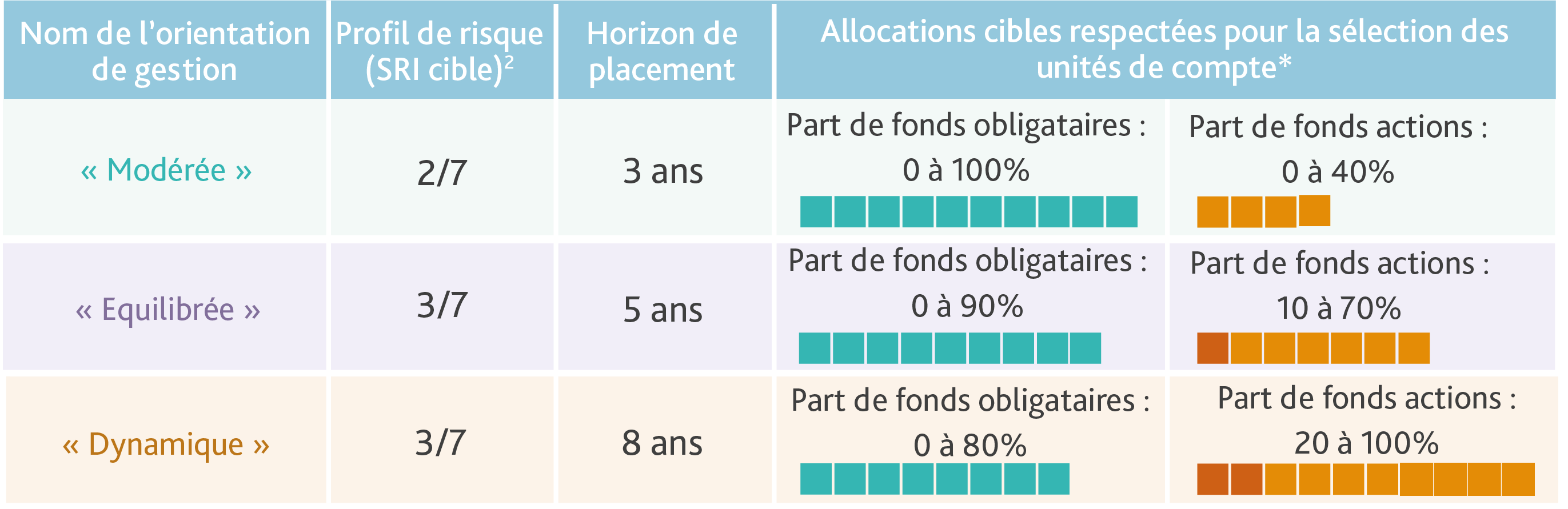 (2)L’indicateur synthétique de risque (SRI) se mesure sur une échelle de 1 à 7, le niveau 7 représentant les supports les plus risqués. Le niveau de risque correspond à l’indicateur de risque figurant dans le Document d’informations spécifiques de chaque orientation de gestion, en date de réalisation du document. En raison de la variation de l’exposition des profils aux différentes catégories de supports, et de la volatilité de chacun des supports sous‑jacents, la valeur du niveau de risque peut évoluer dans le temps.