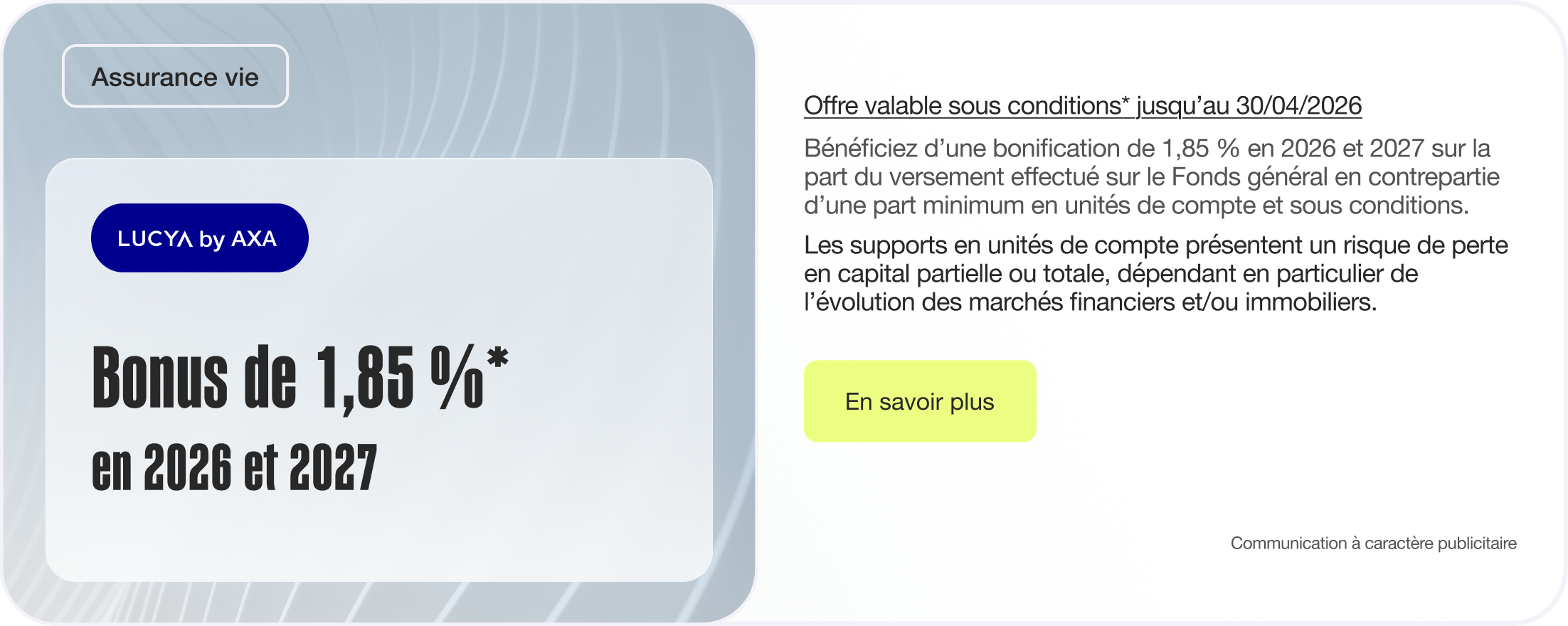 Bénéficiez en 2025 d’un bonus jusqu’à 50% de rendement annuel sur le Fonds Général Lucya by AXA en fonction de la part de votre épargne investie sur des Unités de Compte tout au long de l’année.