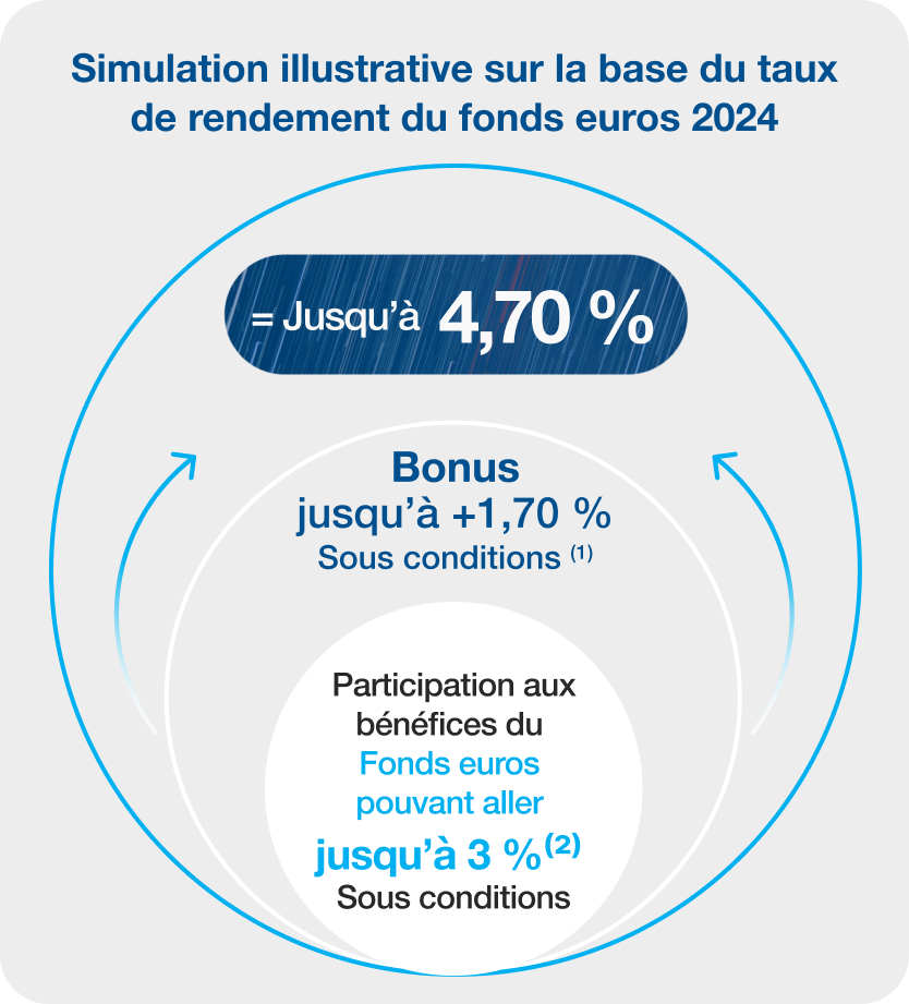 - à un taux égal au taux de participation aux bénéfices définitif du support en euros de votre Contrat(5) du 31/12/2025 pour l’exercice 2025 majoré du bonus de +1,50% ou +1,70% suivant l'offre choisie(4)