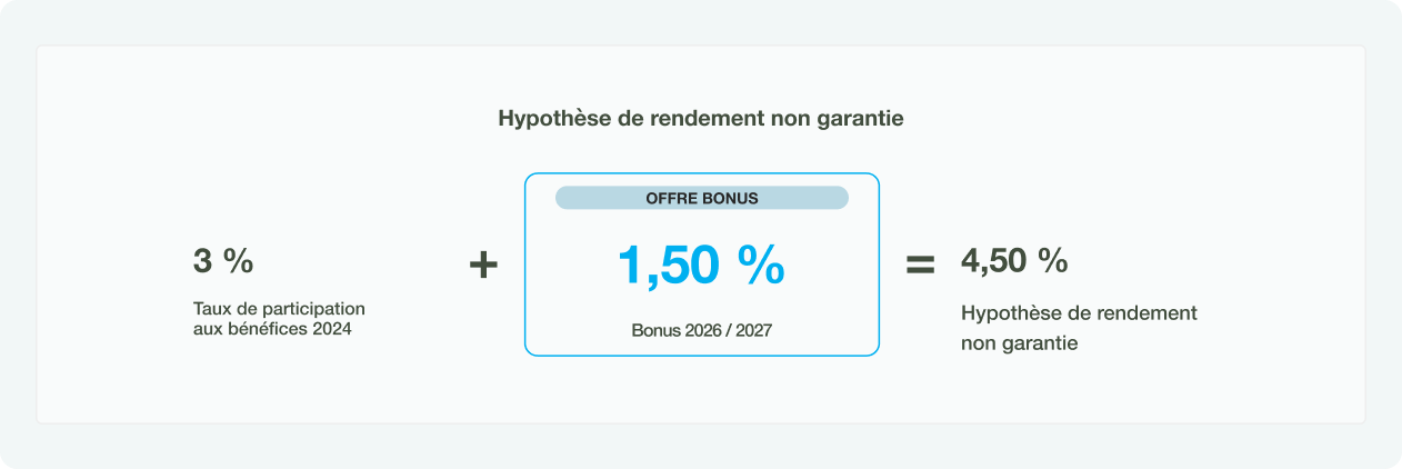Bénéficiez d’une bonification de 1,50 % nets appliquée sur le taux de participation aux bénéfices servi pour les années 2026 et 2027 pour tout nouveau