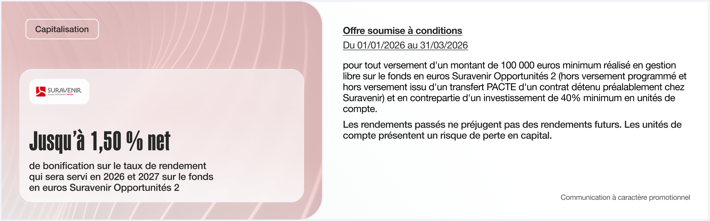 (2)Du 01/01/2026 au 31/03/2026, Suravenir applique une bonification sur le taux de rendement qui sera servi en 2026 et 2027 sur le fonds en euros Suravenir Opportunités 2, en gestion libre. Offre valable pour tout versement d'un montant de 100 000 euros minimum effectué pendant cette période (hors versement programmé et hors versement issu d’un rachat ou d'un transfert Pacte d'un contrat détenu chez Suravenir) : 1,00 % net (3) de bonification pour un versement sans contrainte d’investissement d’unités de compte ou 1,50 % net(3) de bonification pour un versement investi à 40 % minimum en unités de compte. Cette bonification du taux de rendement du fonds en euros Suravenir Opportunités 2 sera appliquée au 31/12/2026 et au 31/12/2027, prorata temporis, à hauteur du ou des versement(s) éligible(s) à l’offre. Tout mouvement de désinvestissement (rachat ou arbitrage) postérieur aux versements intervenus entre le 01/01/2026 et le 31/03/2026 sur le fonds en euros Suravenir Opportunités 2 entraînera en priorité le désinvestissement de l’épargne constituée par des versements ayant bénéficié de la bonification. Les contrats faisant l’objet d’une avance ne sont pas éligibles au dispositif. Suravenir se réserve le droit de mettre fin à l’opération à tout moment, notamment si des évolutions des dispositions réglementaires concernant les taux garantis le nécessitent.