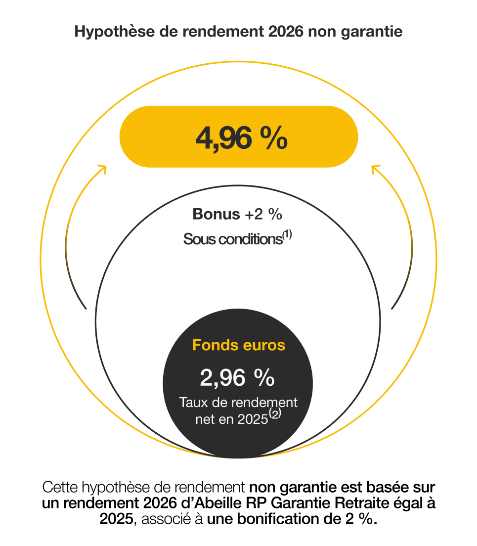 La part du versement investie sur Abeille RP Garantie Retraite dans le cadre de l’opération Abeille Retraite Bonus 2027, toujours investie au 31 décembre 2026 et/ou toujours investie au 31 décembre 2027 et aux dates d’attribution effectives de la participation aux bénéfices, bénéficiera du taux de rendement du support en euros Abeille RP Garantie Retraite au titre du contrat pour l’année 2026 et/ou pour l’année 2027, majoré du complément de rémunération spécifique à l’opération tel que défini dans le paragraphe précédent sous réserve :