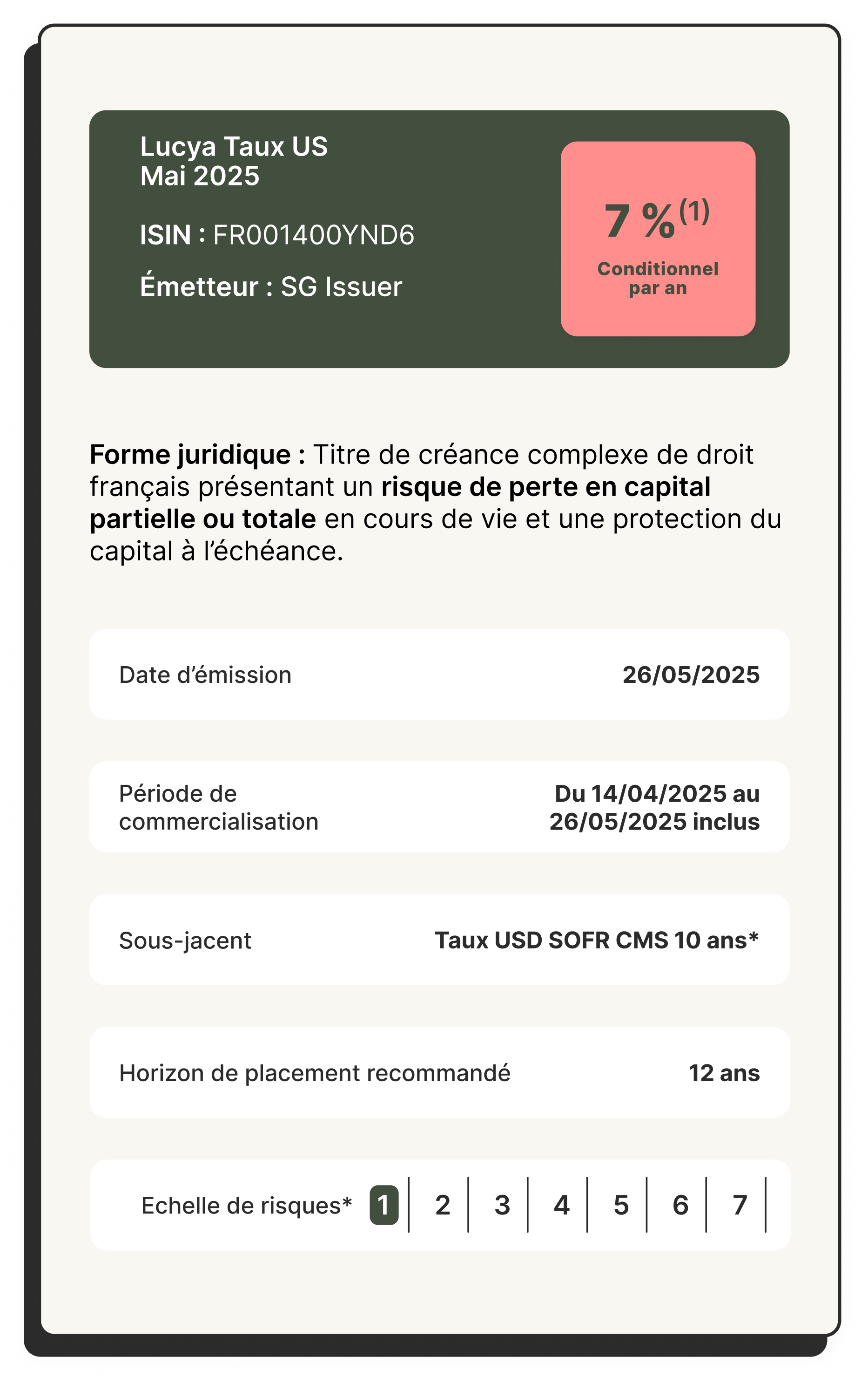 Fort du succès rencontré par le Lucya Taux US Avril 2025, nous avons renouvelé pour vous ce produit opportuniste. Il vous permet de diversifier vos investissements sur un produit de taux américain : LUCYA Taux US Mai 2025». Le capital est garanti à l’échéance(1) et il vise un coupon conditionnel de 7 % brut(2) chaque année.