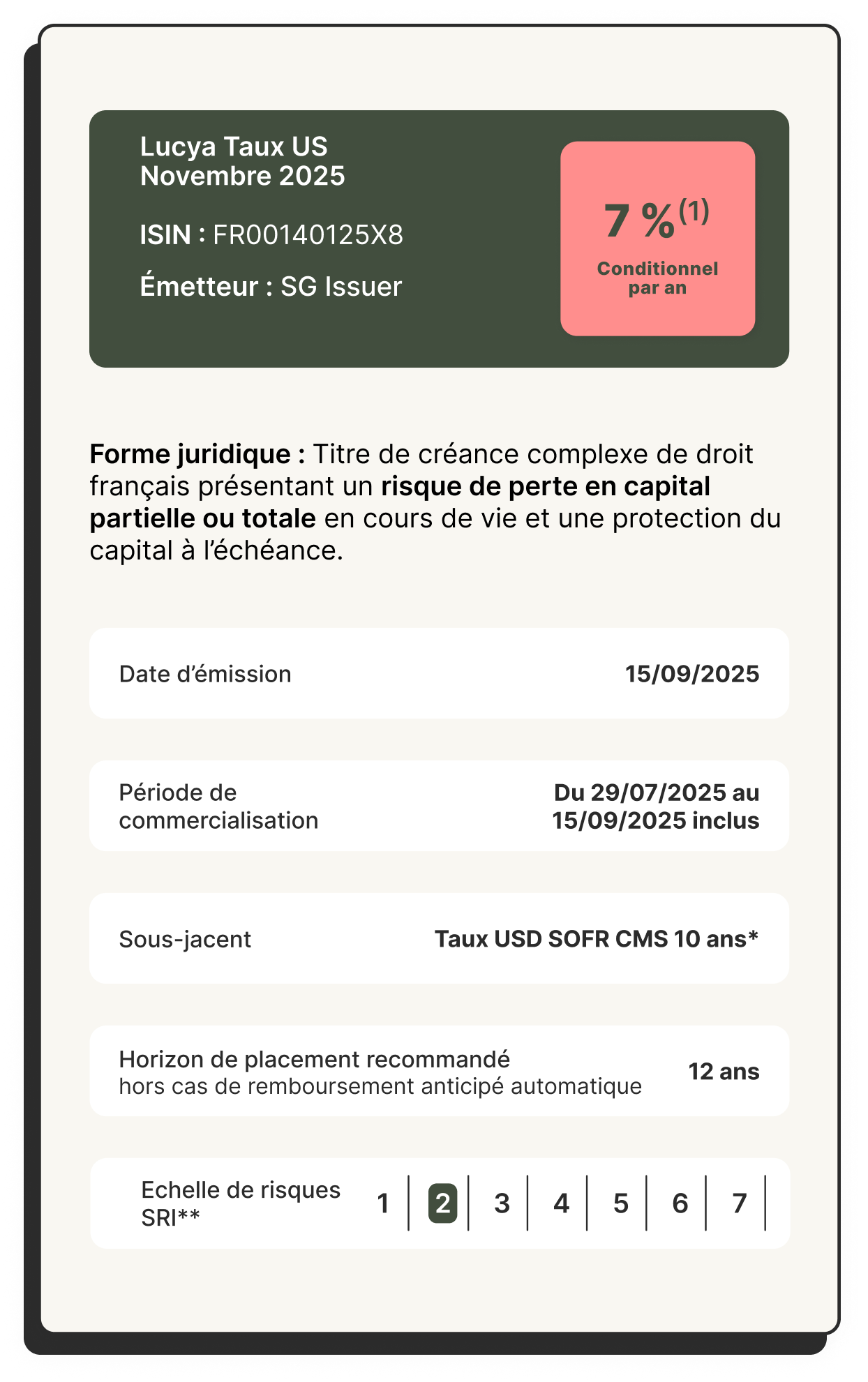 Découvrez la Carte d’identité du produit structuré Lucya Taux US Septembre 2025 :