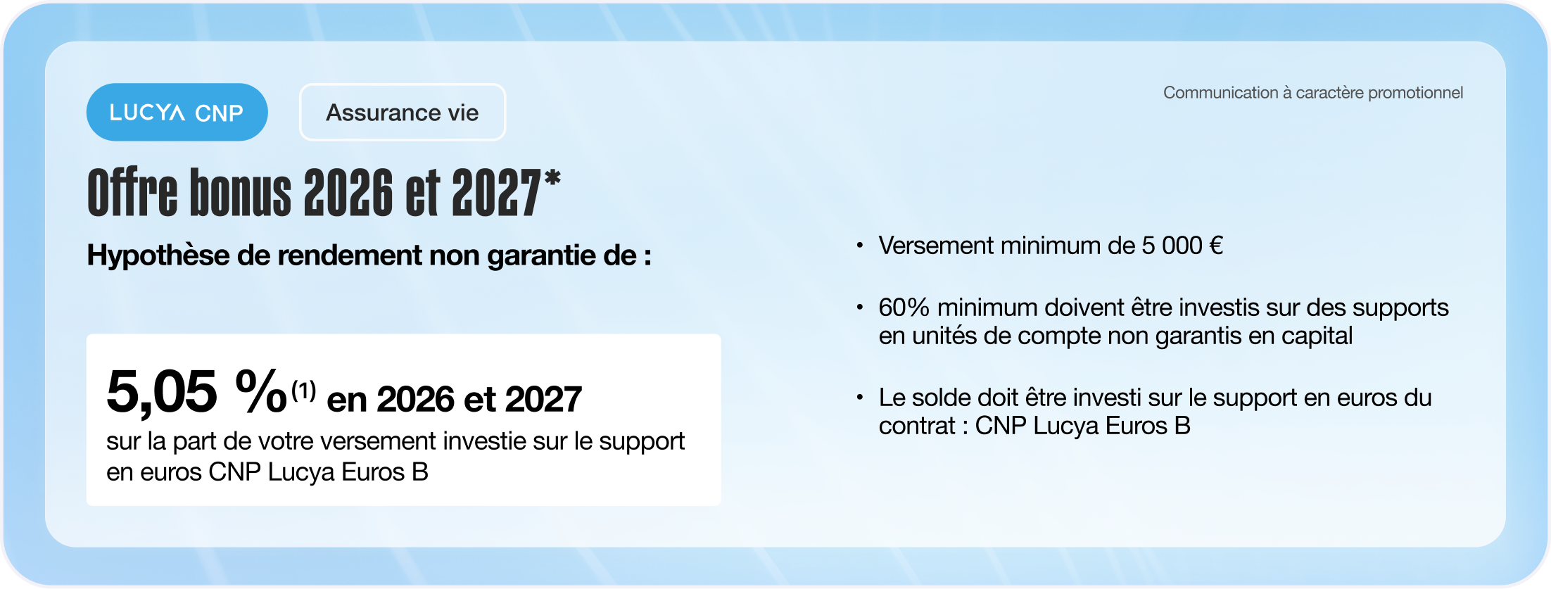 Lucya CNP est un contrat individuel d’assurance sur la vie, libellé en euros et en unités de compte, assuré par CNP Assurances SA et commercialisé par Lucya. Contrat relevant des branches 20 (Vie-Décès) et 22 (assurances liées à des fonds d’investissement) de l’article R. 321-1 du code des assurances.